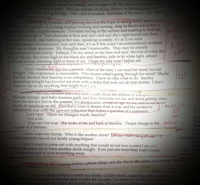 Another higher-level re-ordering has to do with dramatic impact rather than chronology. One such revision arose because, when I get some distance and perspective on my first draft, I saw that the scene where Peter deduces that his father has betrayed him would be more significant to the story if it came at a different point in the novel. Similarly, distance revealed to me that I was reinforcing a characteristic more than I needed to. Lucy, Peter’s wife, was originally shown to be formidable in four scenes, but I realised that less would be more (also that readers don’t need to be given information that they have already absorbed) and cut a lengthy scene in the bookshop she runs.