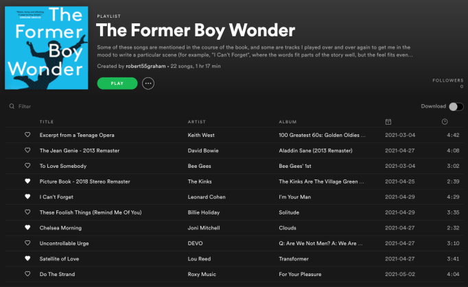 Peter Duffy is a music writer, so it shouldn’t be much of a surprise that the odd song crops up in the course of the book. You can find some of them handily gathered together on a playlist: The Former Boy Wonder. Some of the songs on it are mentioned or described in the course of the novel, and some are tracks I played to get me in the mood to write particular scenes. TFBW looks at first love, mid-life crisis, fathers and sons, sons and fathers, and long-haul marriage. This playlist is meant to nod in all those directions.